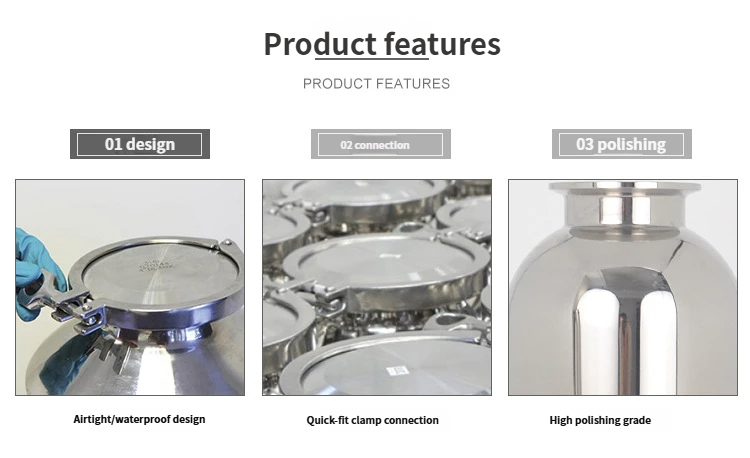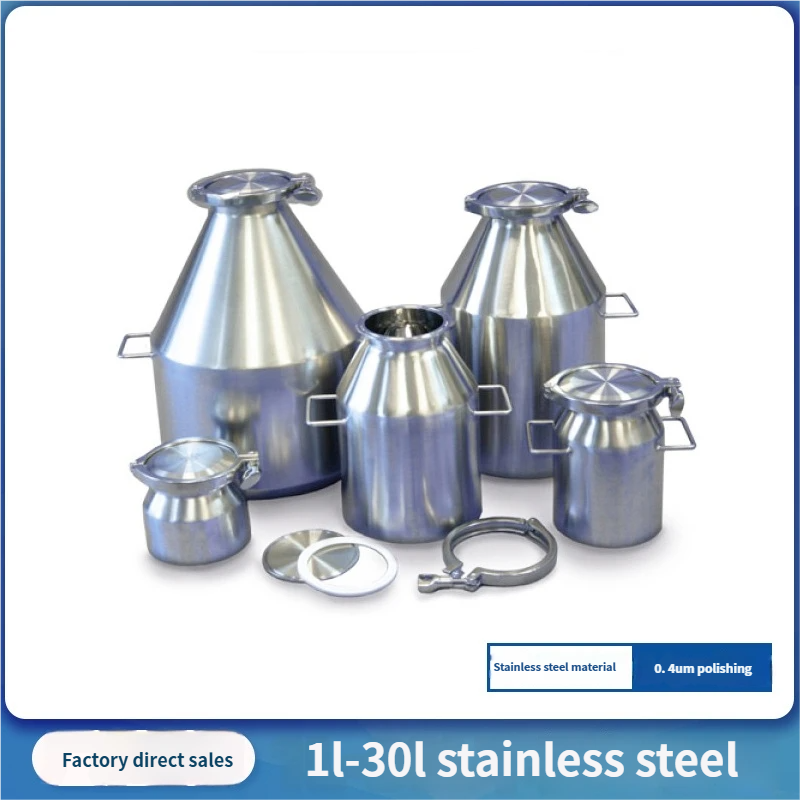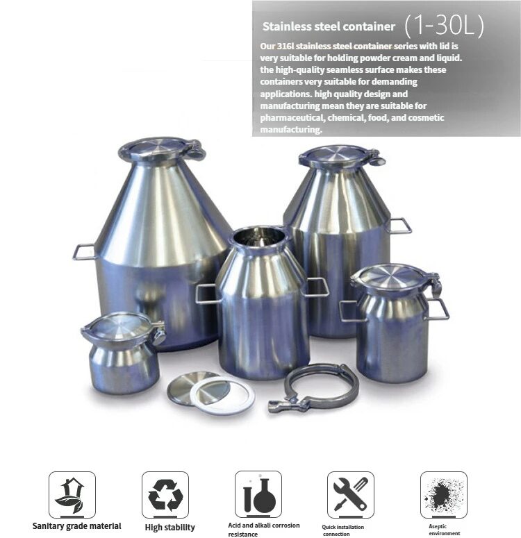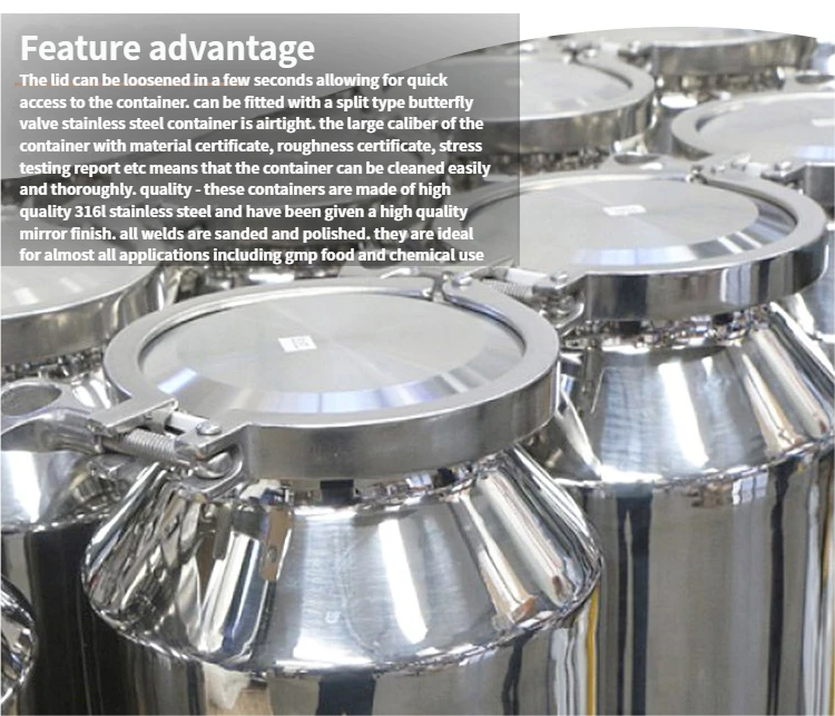 The lid can be loosened in a few seconds allowing for quick access to the container. can be fitted with a split type butterfly valve stainless steel container is airtight. the large caliber of the container with material certificate, roughness certificate, stress testing report etc means that the container can be cleaned easily and thoroughly. quality -these containers are made of high quality 316l stainless steel and have been given a high quality mirror finish. all welds are sanded and polished. they are ideal for almost all applications including gmp food and chemical use
